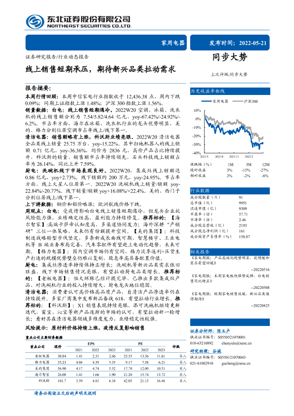 【东北证券】【20220521】家用电器行业:线上销售短期承压,期待新兴品类拉动需求-15页