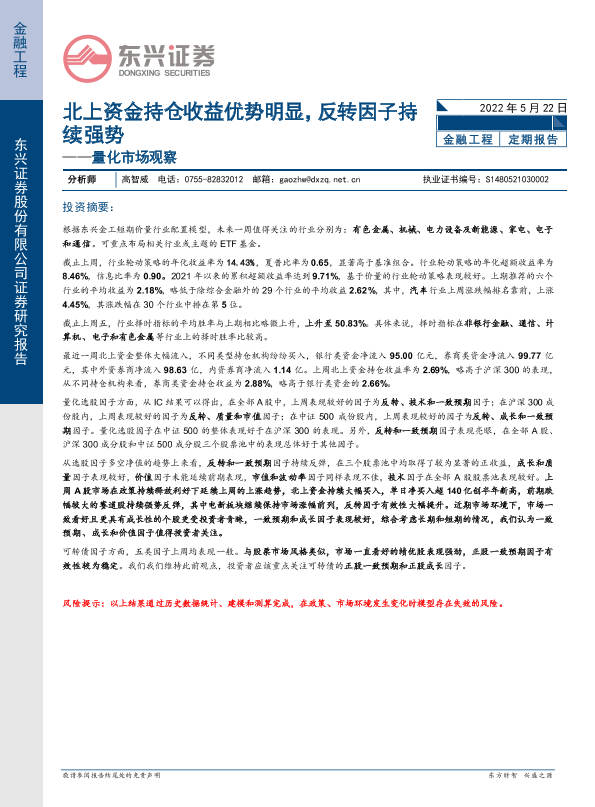 【东兴证券】【20220522】量化市场观察:北上资金持仓收益优势明显,反转因子持续强势-20页