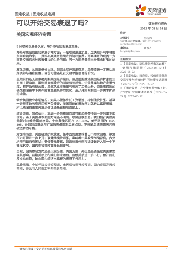 【天风证券】【20220524】美国宏观经济专题:可以开始交易衰退了吗?-19页
