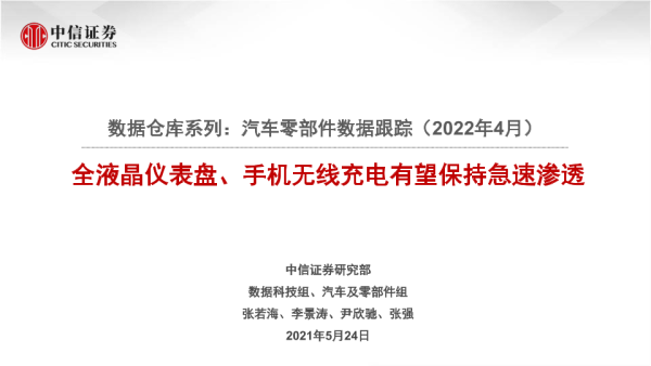 【中信证券】【20220524】汽车及零部件行业数据仓库系列:汽车零部件数据跟踪(2022年4月),全液晶仪表盘、手机无线充电有望保持急速渗透-21页