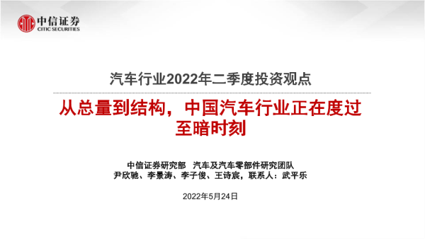 【中信证券】【20220524】汽车行业2022年二季度投资观点:从总量到结构,中国汽车行业正在度过至暗时刻-27页
