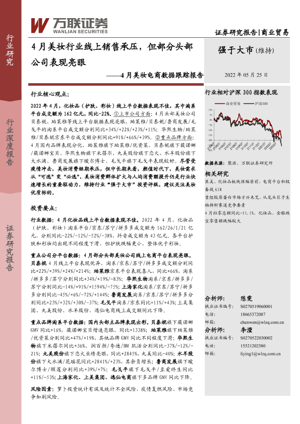 【万联证券】【20220525】商业贸易行业4月美妆电商数据跟踪报告:4月美妆行业线上销售承压,但部分头部公司表现亮眼-16页