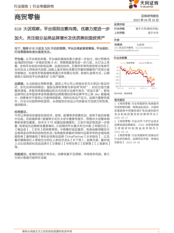 【天风证券】【20220525】商贸零售行业618大促观察:平台规则由繁向简,优惠力度进一步加大,关注细分品类品牌增长及优质美妆国货资产-28页