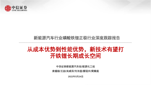 【中信证券】【20220524】新能源汽车行业磷酸铁锂正极行业深度跟踪报告:从成本优势到性能优势,新技术有望打开铁锂长期成长空间-40页