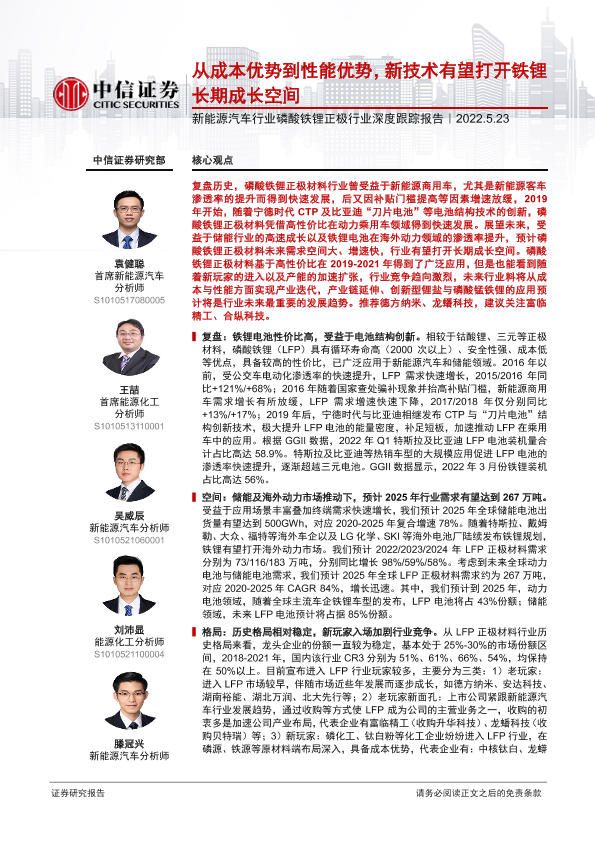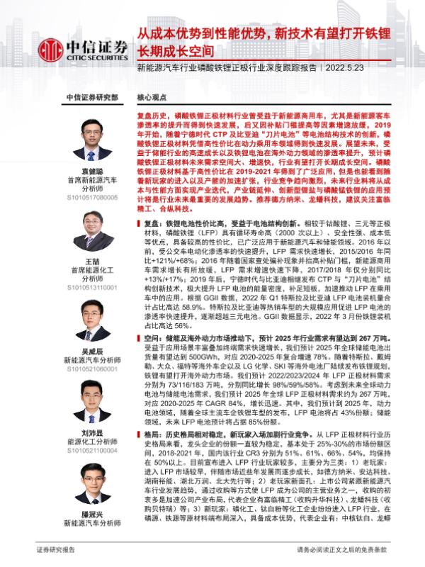 【中信证券】【20220523】新能源汽车行业磷酸铁锂正极行业深度跟踪报告:从成本优势到性能优势,新技术有望打开铁锂长期成长空间-27页