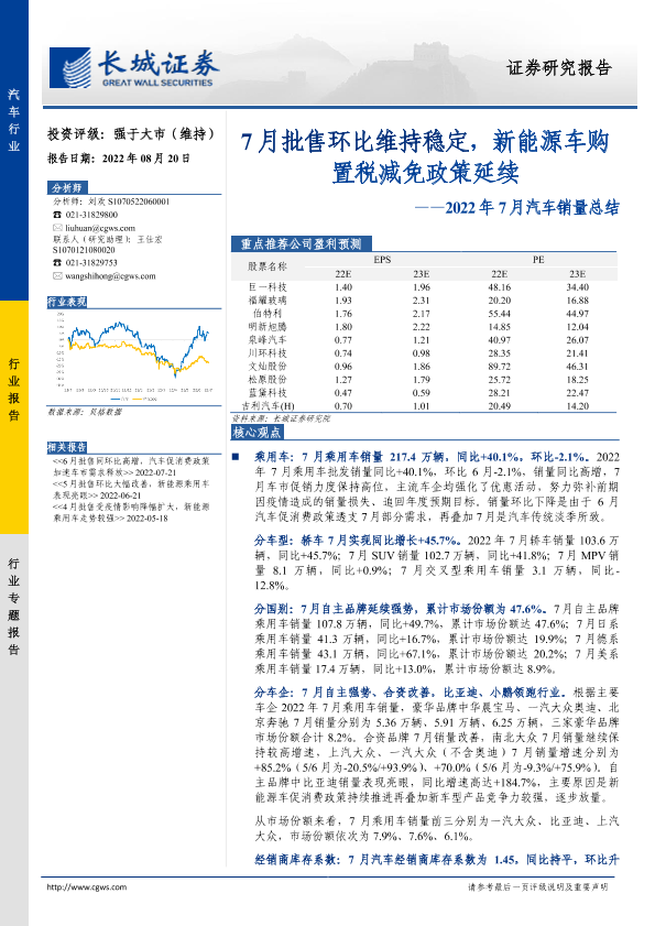【长城证券】【20220820】2022年7月汽车行业销量总结:7月批售环比维持稳定,新能源车购置税减免政策延续-23页