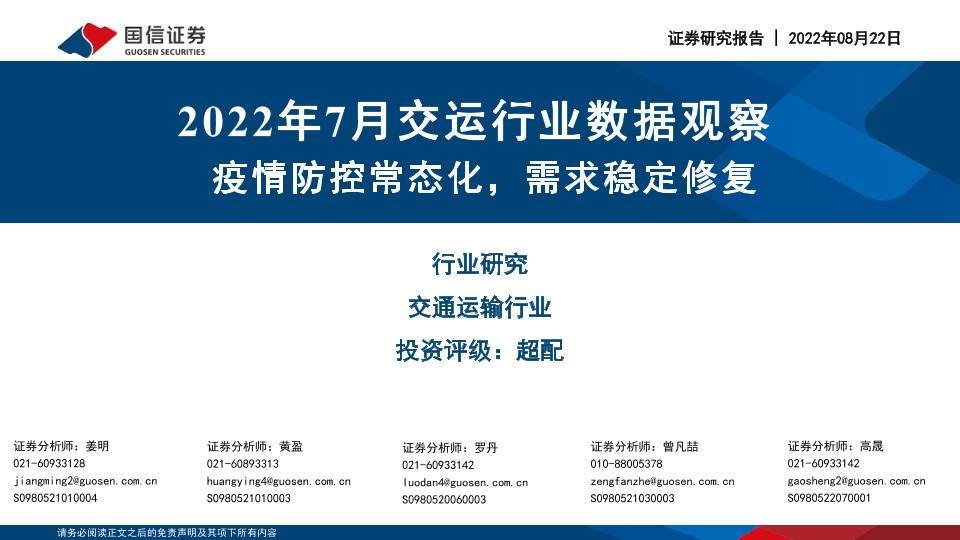 【国信证券】【20220822】2022年7月交运行业数据观察:疫情防控常态化,需求稳定修复-19页