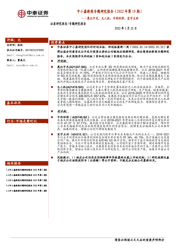 【中泰证券】【20220522】中小盘新股专题研究报告(2022年第19期):奥比中光、无人机、中科环保、宏宇五洲-23页