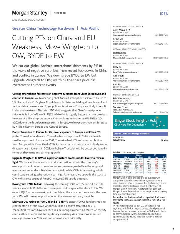 【Morgan Stanley】【20220517】摩根士丹利-亚太地区投资策略-因中国和欧盟的疲软而削减PT股;将闻泰科技调至OW,比亚迪电子调至EW-64页