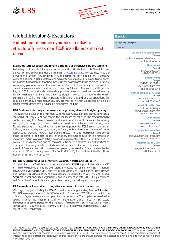 【瑞银】【20220518】瑞银-全球电梯和自动扶梯行业-强劲的维护动态将抵消未来结构性疲软的新机电设备市场-50页