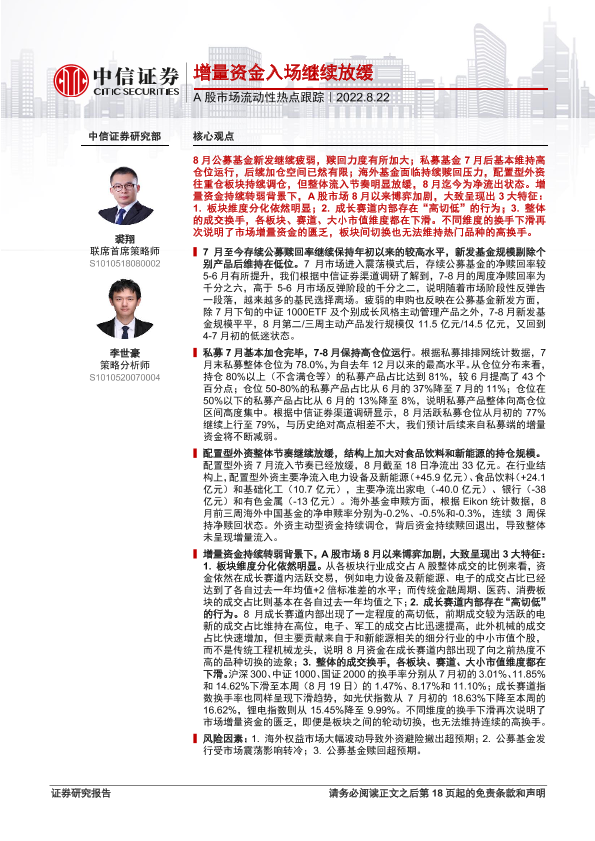 【中信证券】【20220822】A股市场流动性热点跟踪:增量资金入场继续放缓-19页