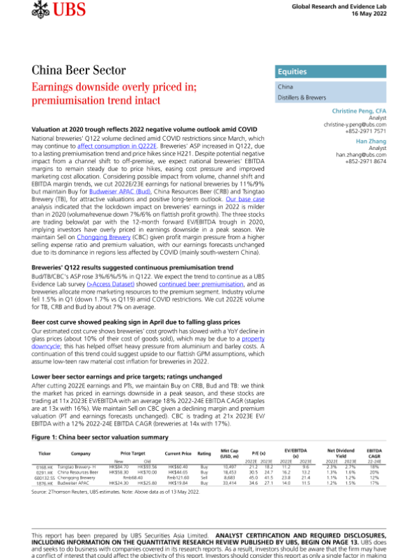 【瑞银】【20220516】瑞银-中国啤酒行业-盈利下行已被过度市场消化;溢价趋势保持不变-22页