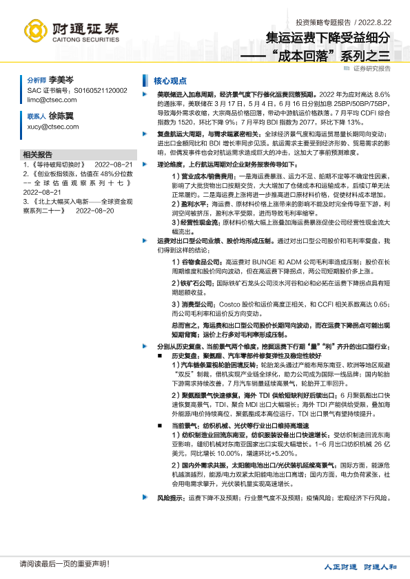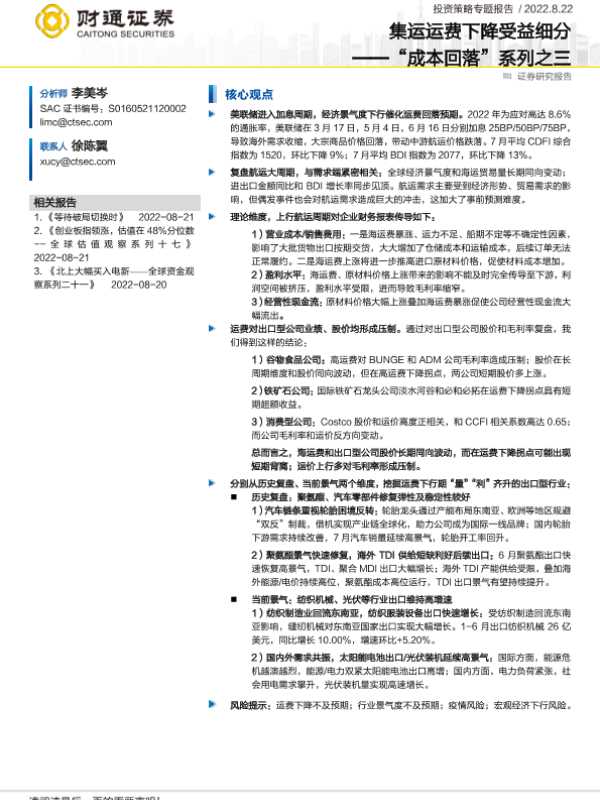 【财通证券】【20220822】“成本回落”系列之三:集运运费下降受益细分-22页