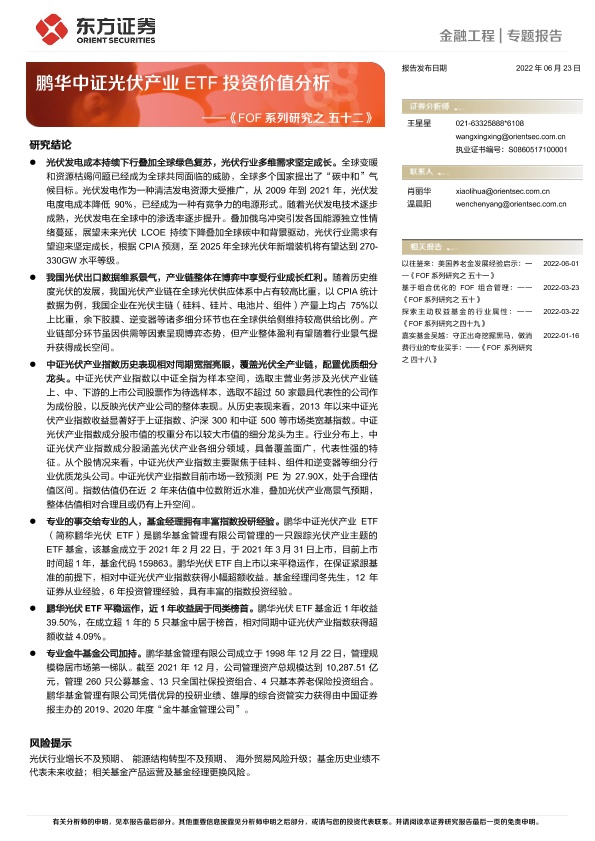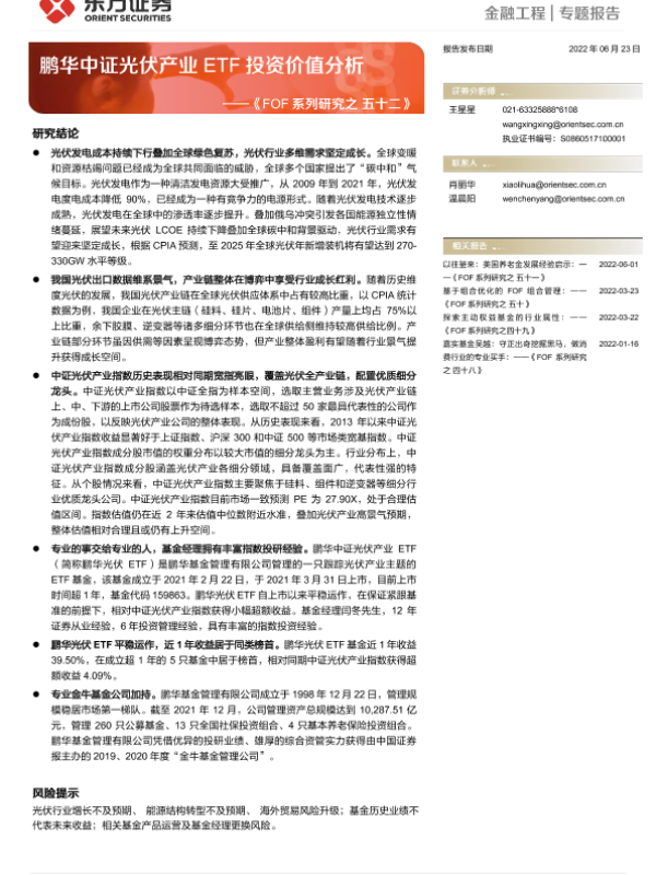 【东方证券】【20220623】《FOF系列研究之五十二》:鹏华中证光伏产业ETF投资价值分析-20页