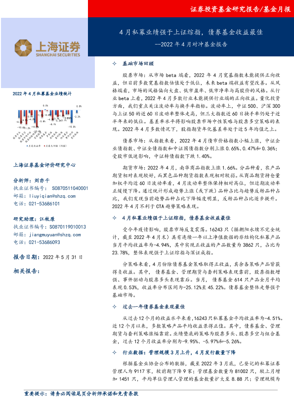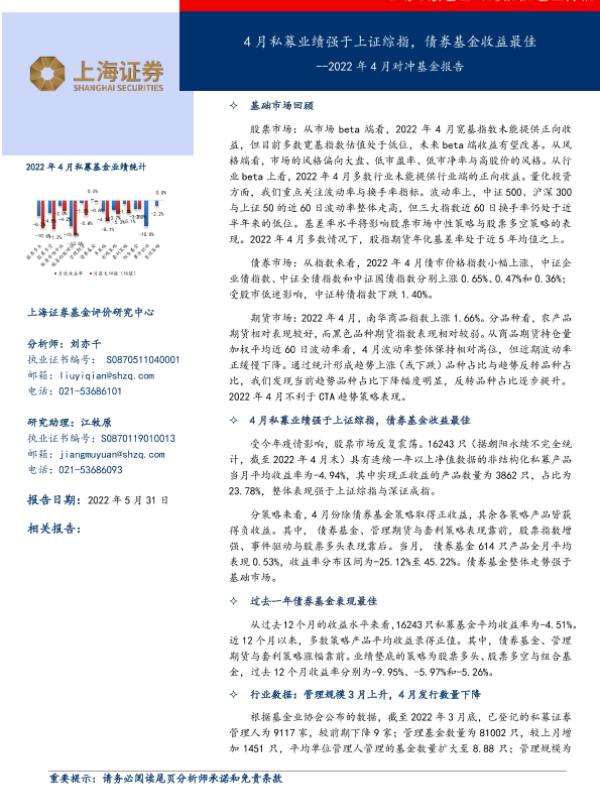 【上海证券】【20220531】2022年4月对冲基金报告:4月私募业绩强于上证综指,债券基金收益最佳-18页