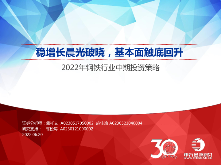 【申万宏源】【20220620】2022年钢铁行业中期投资策略:稳增长晨光破晓,基本面触底回升-39页