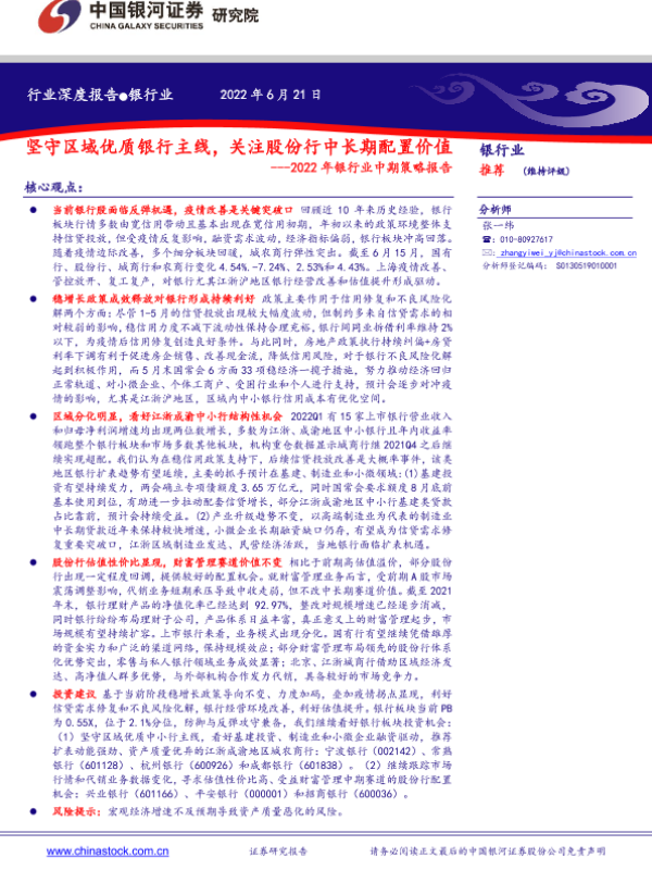 【银河证券】【20220621】2022年银行业中期策略报告:坚守区域优质银行主线,关注股份行中长期配置价值-22页