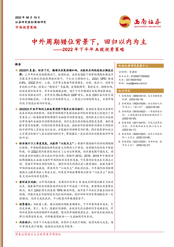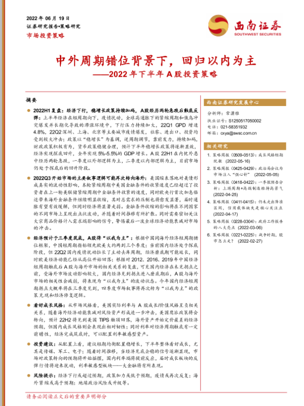 【西南证券】【20220619】2022年下半年A股投资策略:中外周期错位背景下,回归以内为主-30页