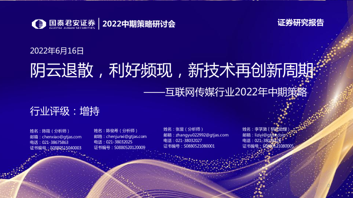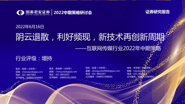 【国泰君安证券】【20220616】2022中期策略研讨会:互联网传媒行业2022年中期策略,阴云退散,利好频现,新技术再创新周期-92页