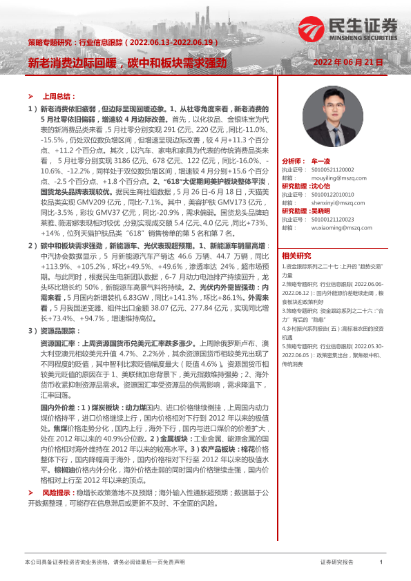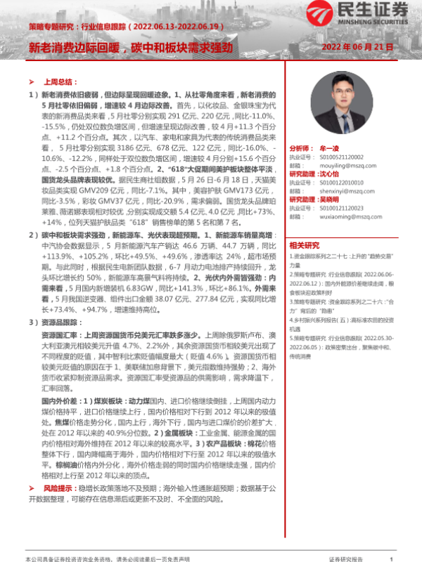 【民生证券】【20220621】策略专题研究:行业信息跟踪,新老消费边际回暖,碳中和板块需求强劲-26页