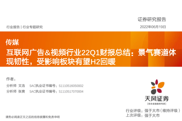 【天风证券】【20220619】传媒行业专题研究:互联网广告&视频行业22Q1财报总结,景气赛道体现韧性,受影响板块有望H2回暖-31页