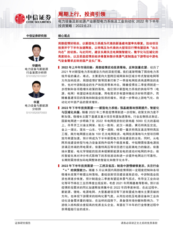 【中信证券】【20220623】电力设备及新能源行业产业新型电力系统及工业自动化2022年下半年投资策略:周期上行,投资引领-16页