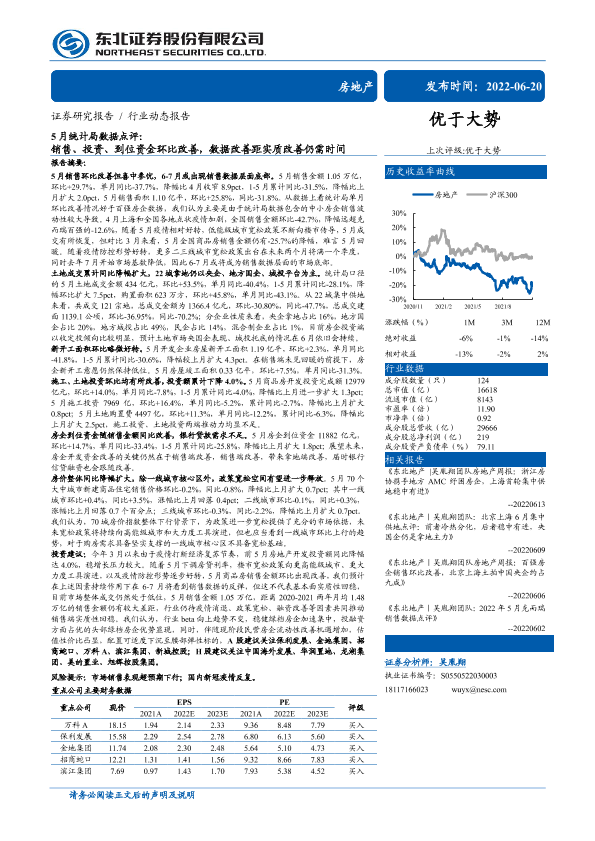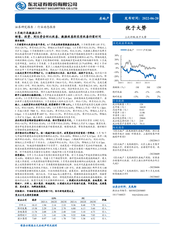 【东北证券】【20220620】房地产行业5月统计局数据点评:销售、投资、到位资金环比改善,数据改善距实质改善仍需时间-20页