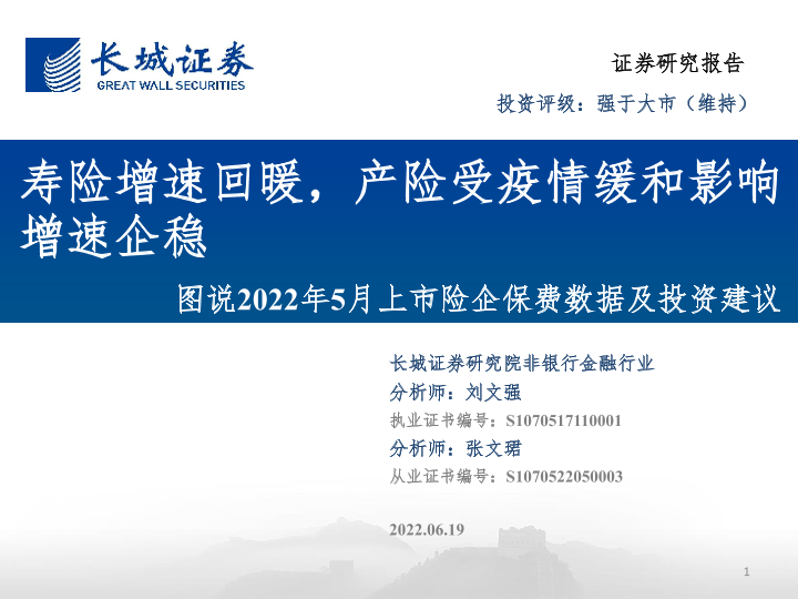 【长城证券】【20220619】非银行金融行业图说2022年5月上市险企保费数据及投资建议:寿险增速回暖,产险受疫情缓和影响增速企稳-30页