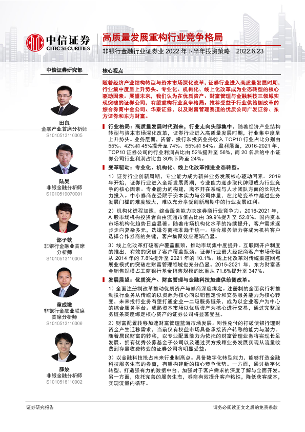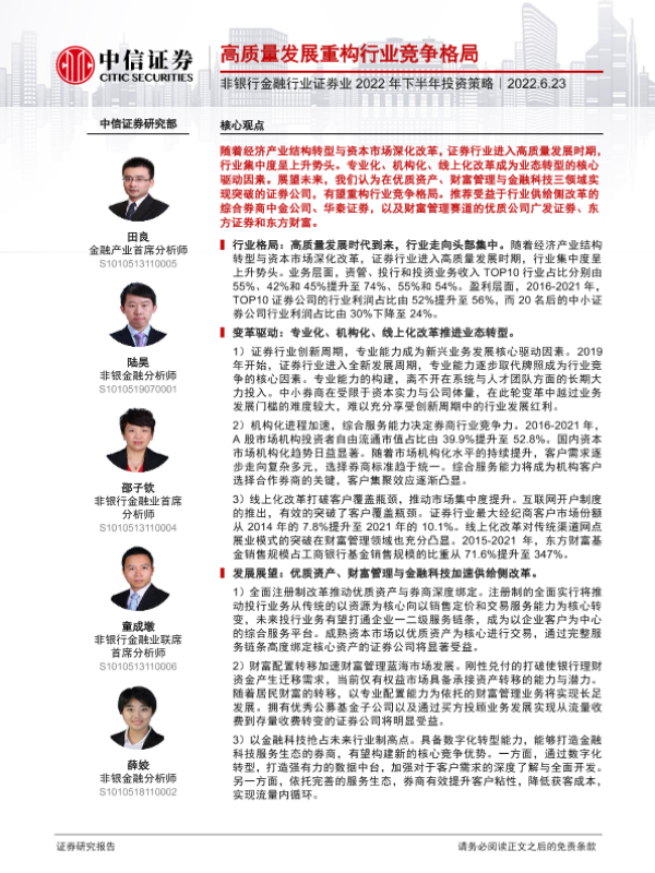【中信证券】【20220623】非银行金融行业证券业2022年下半年投资策略:高质量发展重构行业竞争格局-17页