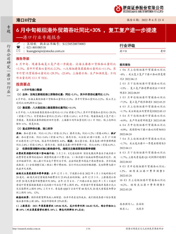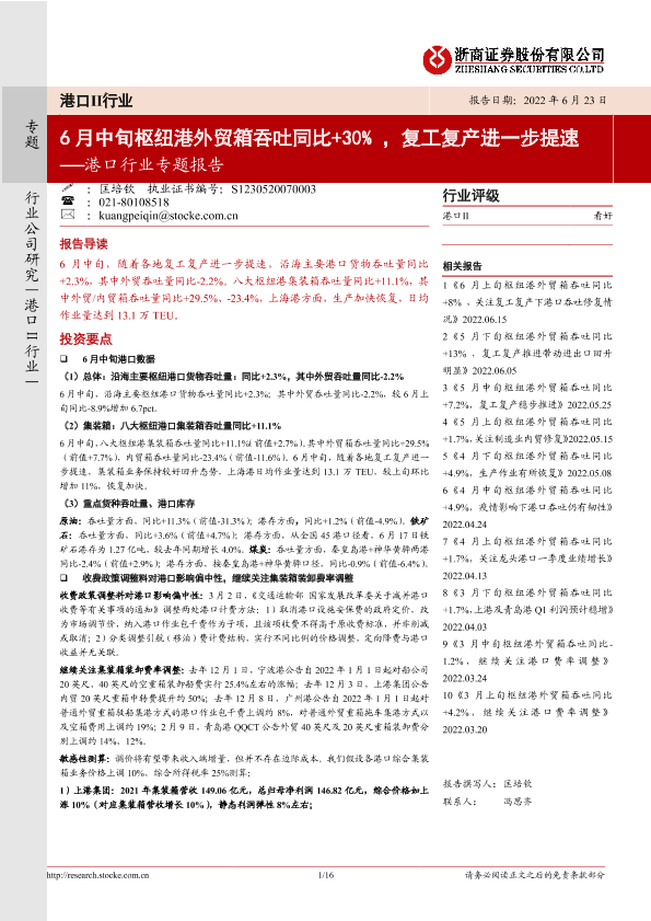 【浙商证券】【20220623】港口行业专题报告:6月中旬枢纽港外贸箱吞吐同比+30%,复工复产进一步提速-16页