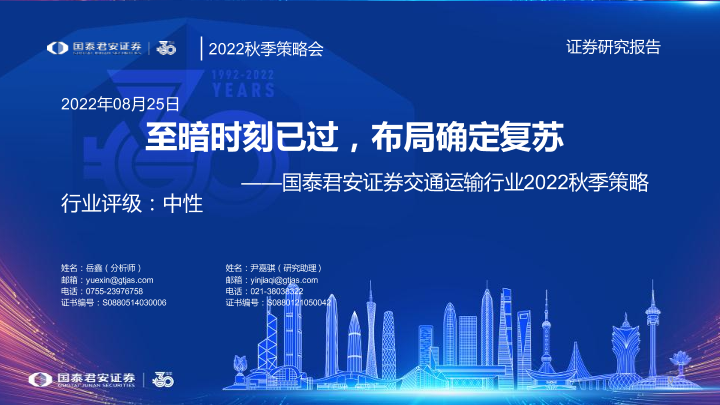 【国泰君安证券】【20220825】交通运输行业2022秋季策略:至暗时刻已过,布局确定复苏-41页