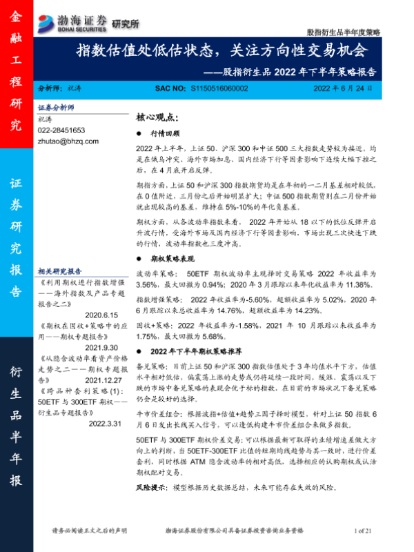 【渤海证券】【20220624】股指衍生品2022年下半年策略报告:指数估值处低估状态,关注方向性交易机会-21页