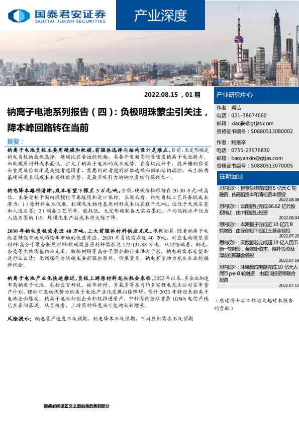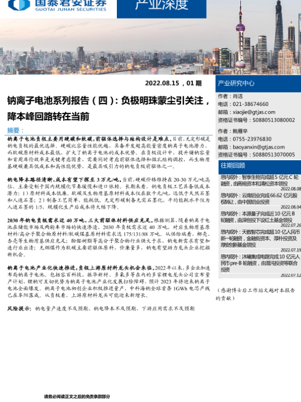 【国泰君安证券】【20220820】产业深度01期:钠离子电池系列报告(四),负极明珠蒙尘引关注,降本峰回路转在当前-22页