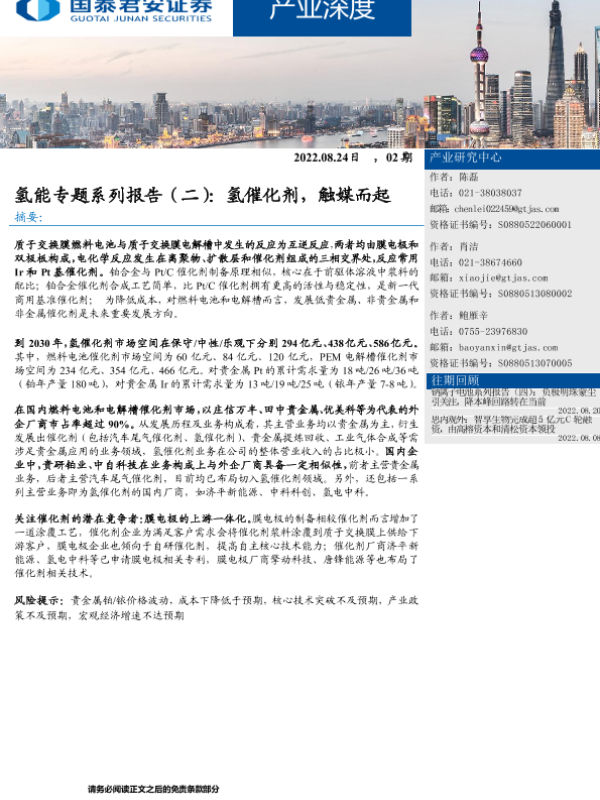 【国泰君安证券】【20220824】产业深度:氢能专题系列报告(二),氢催化剂,触媒而起-23页