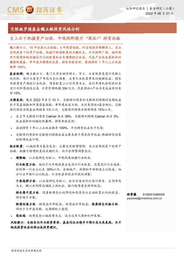 【海通证券】【20220621】交银施罗德基金魏玉敏投资风格分析:自上而下把握资产切换,中观视野提升“固收+”持有体验-18页