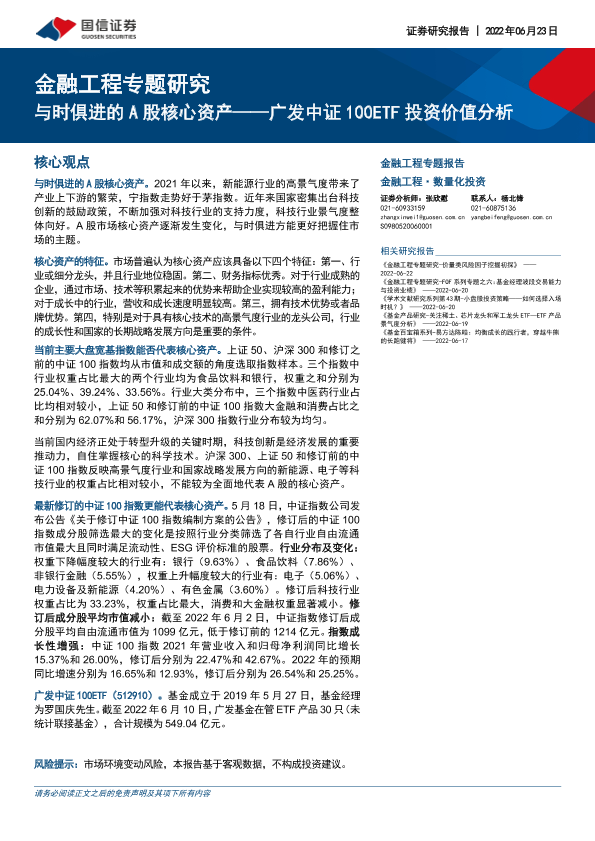 【国信证券】【20220623】金融工程专题研究:广发中证100ETF投资价值分析,与时俱进的A股核心资产-15页