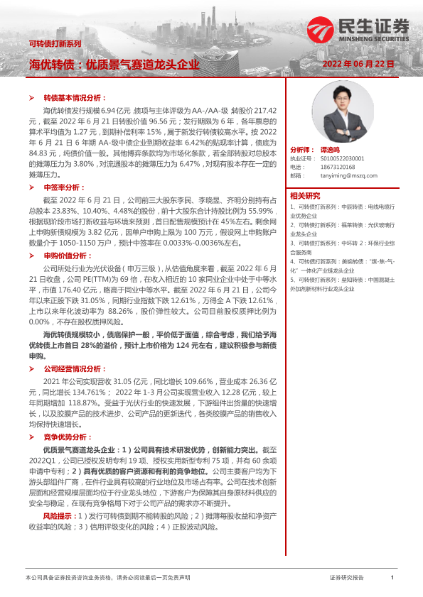 【民生证券】【20220622】可转债打新系列:海优转债,优质景气赛道龙头企业-15页
