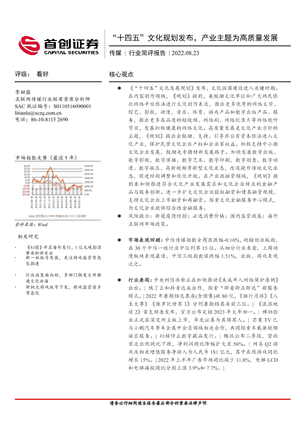 【首创证券】【20220823】传媒行业简评报告:“十四五”文化规划发布,产业主题为高质量发展-15页