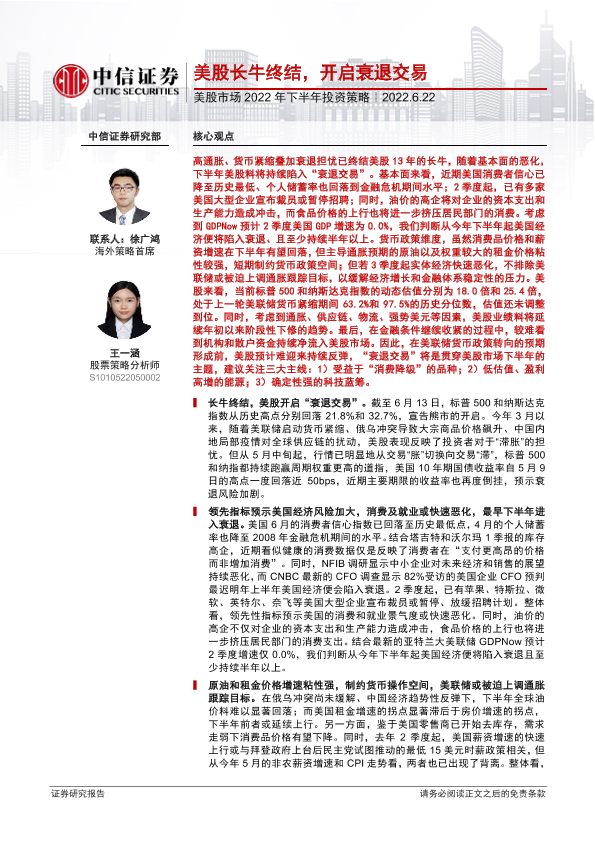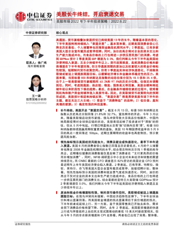 【中信证券】【20220622】美股市场2022年下半年投资策略:美股长牛终结,开启衰退交易-26页