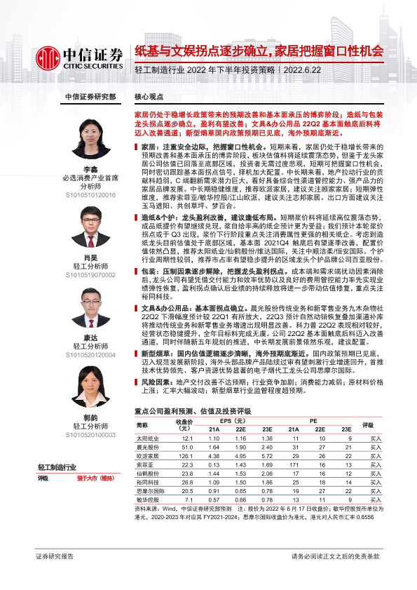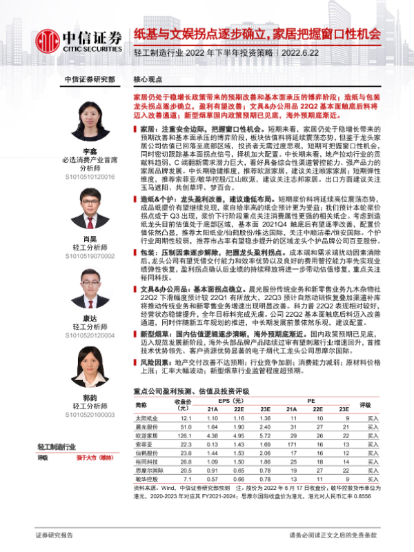 【中信证券】【20220622】轻工制造行业2022年下半年投资策略:纸基与文娱拐点逐步确立,家居把握窗口性机会-30页