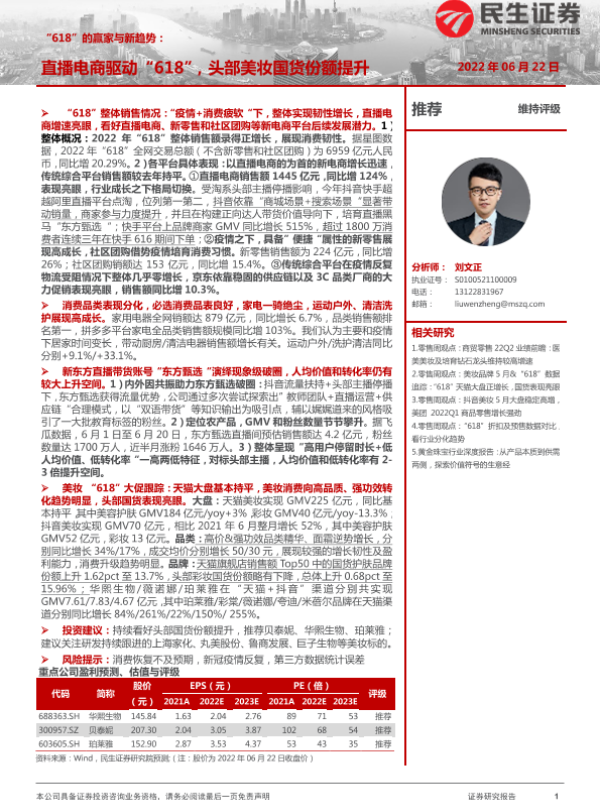 【民生证券】【20220622】商贸零售行业“618”的赢家与新趋势:直播电商驱动“618”,头部美妆国货份额提升-21页