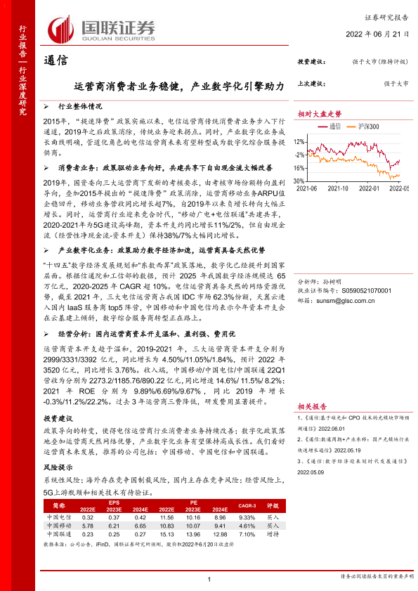 【国联证券】【20220621】通信行业:运营商消费者业务稳健,产业数字化引擎助力-43页