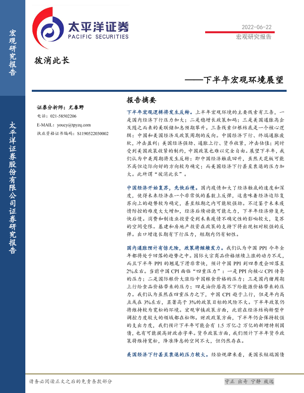 【太平洋证券】【20220622】下半年宏观环境展望:彼消此长-35页