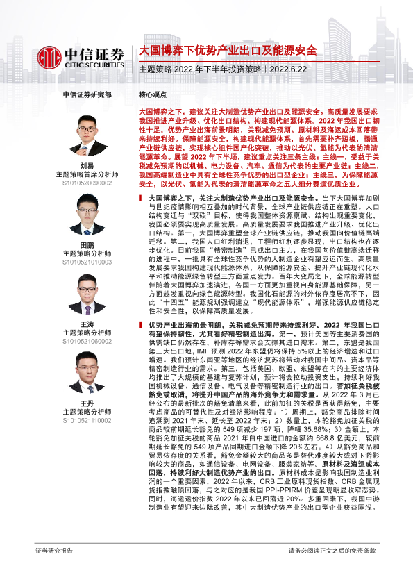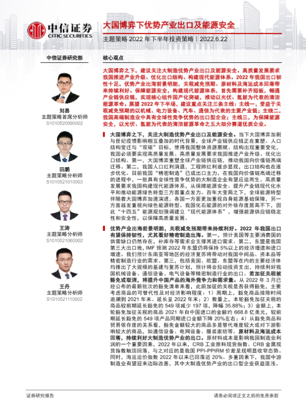 【中信证券】【20220622】主题策略2022年下半年投资策略:大国博弈下优势产业出口及能源安全-33页