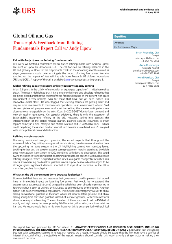 【瑞银】【20220614】瑞银-美股石油和天然气行业-炼油基础知识专家电话会议的记录和反馈-资深石油分析师安迪·利波-28页