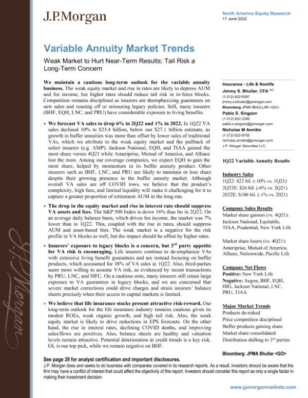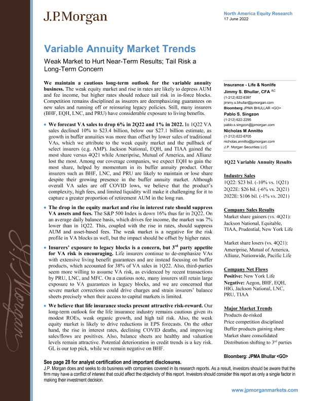 【J.P. Morgan】【20220617】变额年金市场趋势:疲软的市场将损害近期的业绩;尾部风险是长期的担忧-32页