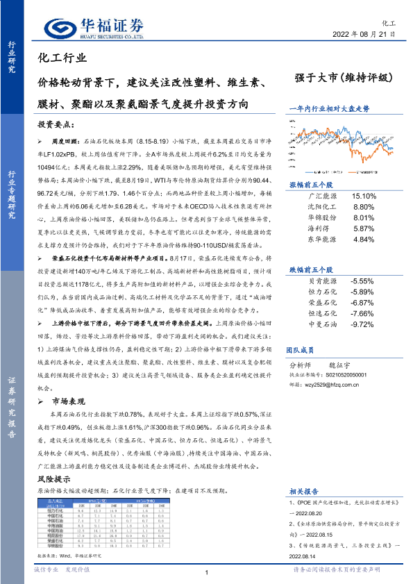【华福证券】【20220821】化工行业专题研究:价格轮动背景下,建议关注改性塑料、维生素、膜材、聚酯以及聚氨酯景气度提升投资方向-17页
