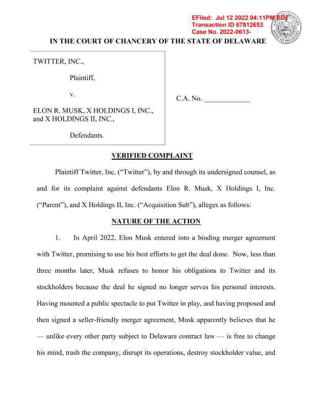 【Twitter】【20220712】推特诉马斯克起诉状-62页