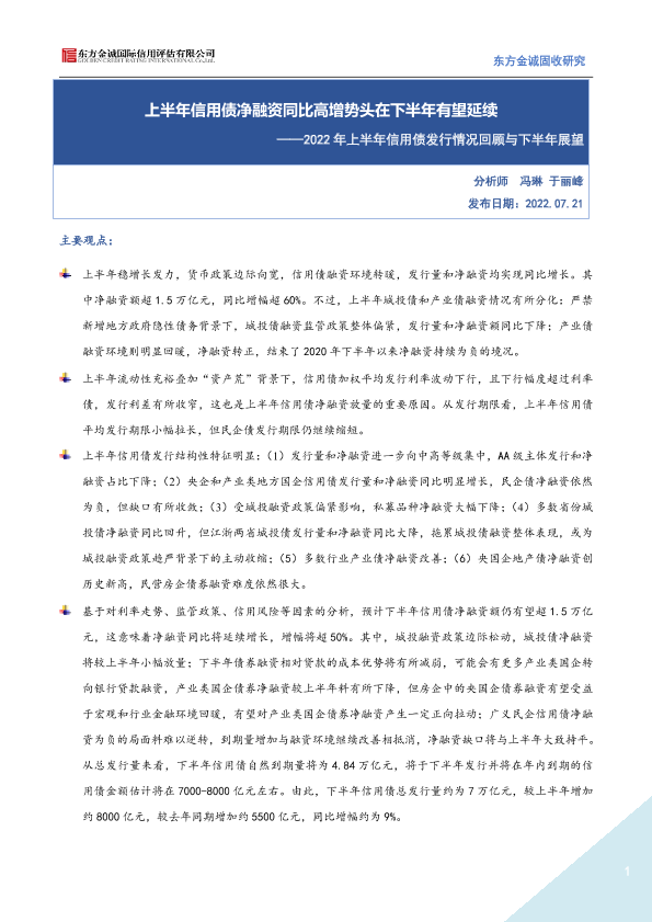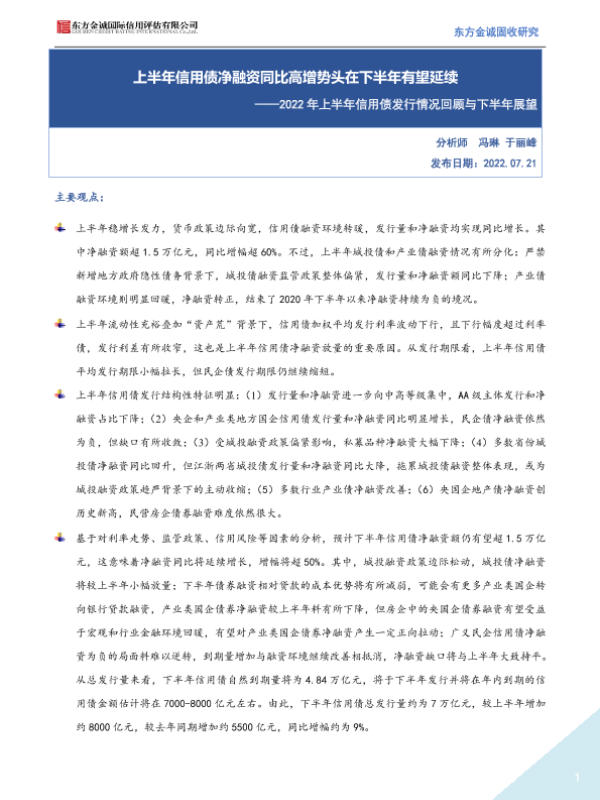 【东方金诚】【20220721】2022年上半年信用债发行情况回顾与下半年展望:上半年信用债净融资同比高增势头在下半年有望延续-23页