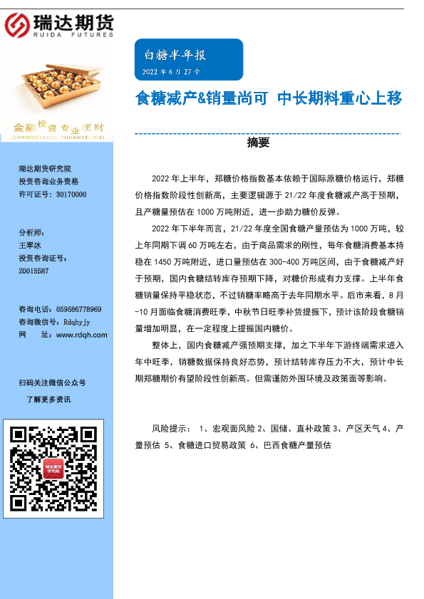 【瑞达期货】【20220627】白糖半年报:食糖减产&销量尚可,中长期料重心上移-20页